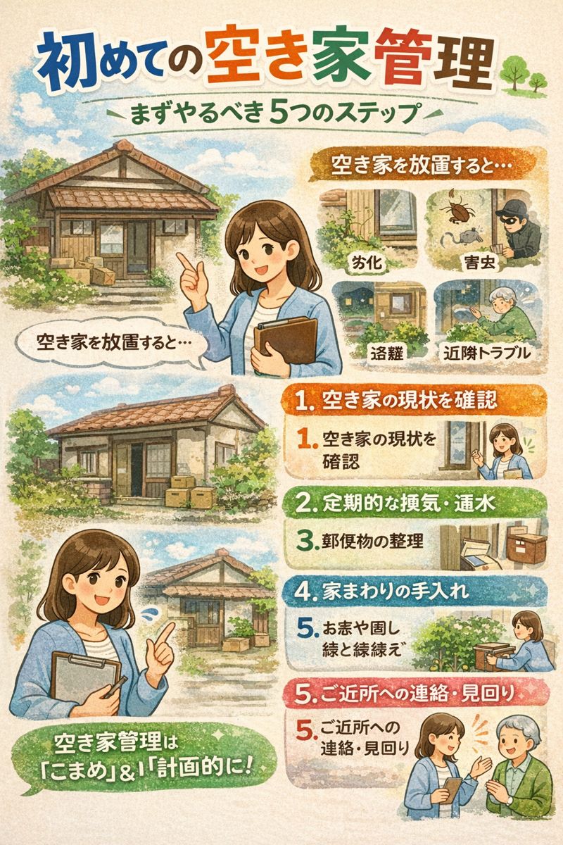 空き家を初めて管理する方に向けて、何から始めるべきか分かりやすく解説します。適切な管理は、資産価値の維持だけでなく、地域社会への貢献にも繋がります。この記事では、空き家管理の基本から、具体的な対策、注意点までを網羅的にご紹介します。