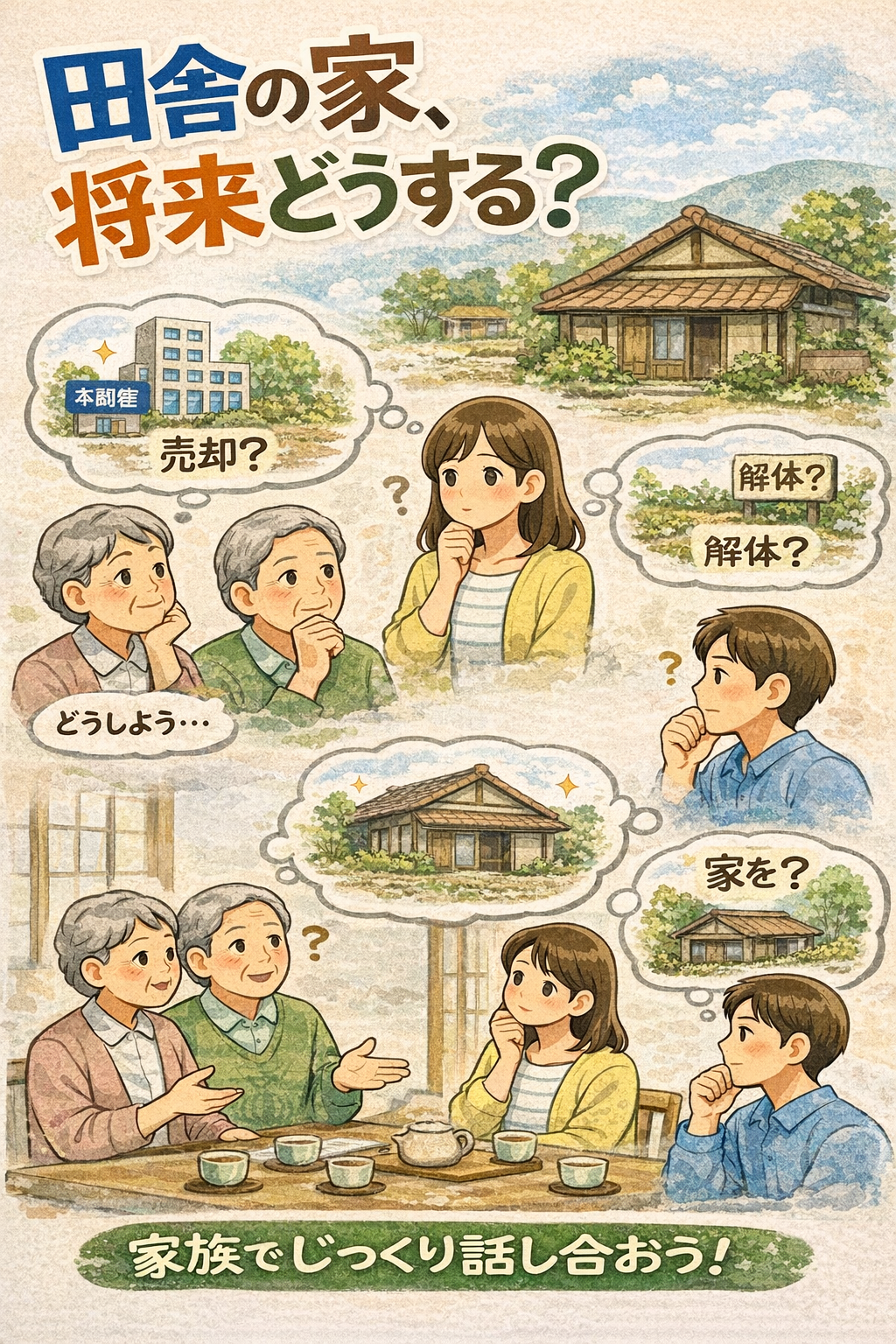 もし、話し合いが難航する場合は、第三者の意見を聞くことも有効です。専門家や信頼できる知人に相談することで、客観的な視点からアドバイスを受けることができます。田舎の家の将来は、家族にとって大きな問題ですが、適切な対策を講じることで、安心して未来を迎えることができます。焦らず、じっくりと検討し、後悔しない選択をしましょう。