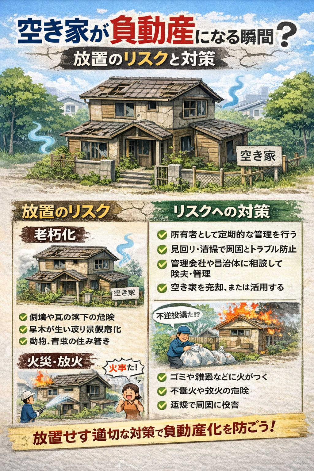 空き家を放置すると、税金や管理費がかさみ、最終的には売却も困難になる「負動産」へと変わってしまいます。この記事では、空き家が負動産化する理由やリスク、そして負動産にしないための対策について解説します。